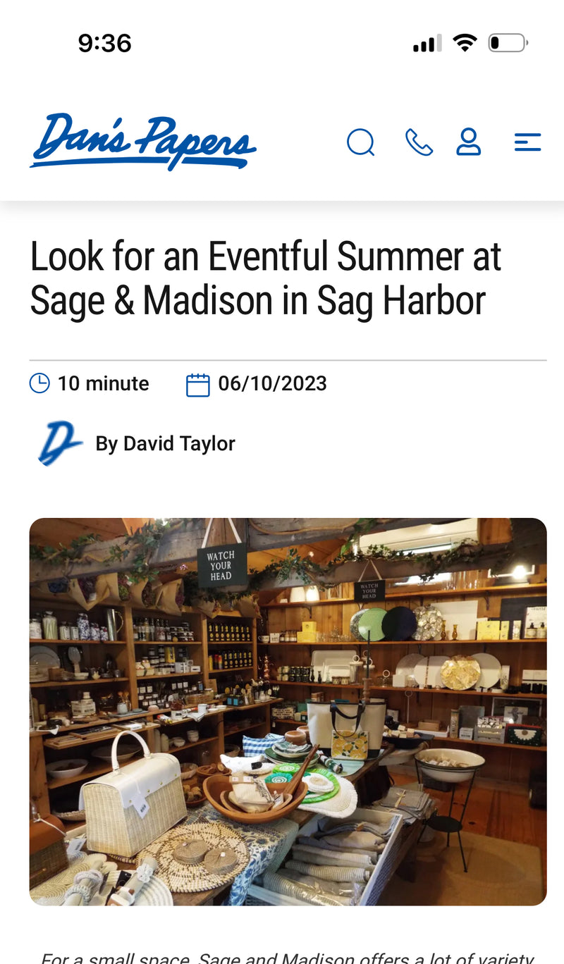 "Enter the world of Sage and Madison in Sag Harbor Village and expect to be charmed. It won’t take long. The historic barn-turned-year-round-gift shop is brimming with treats and finds of all kinds: everything from local teas and honey, French teas (Mariage Frères), imported chocolates, French glass, Scottish cashmere, vintage jewelry, local art to high end table tops, curated gift baskets, china and an endless array of unique gift items that spell charm with a capital C."