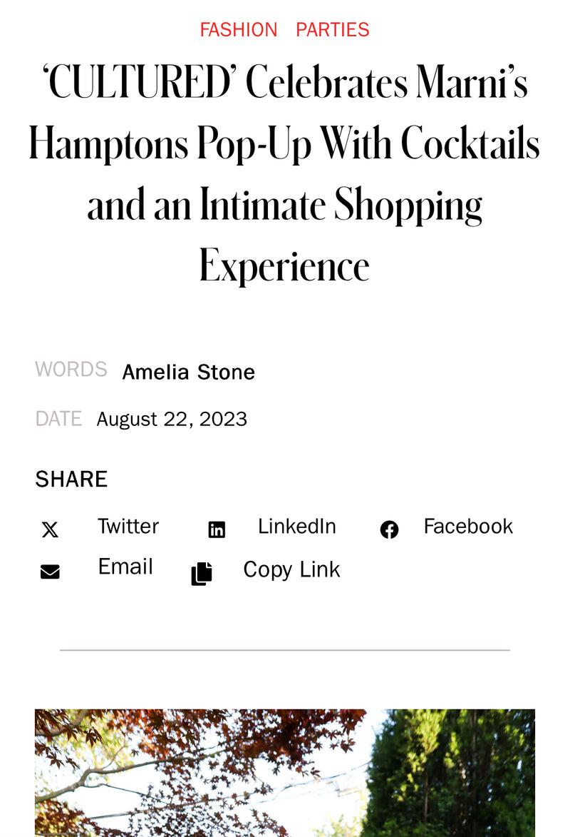"Last Saturday, Marni and CULTURED rung in summer's last hurrah at Sag Harbor's Sage & Madison. Built in 1797, the historic digs are now home to a hotel and barn boutique steps away from the Sag Harbor Bay. The event celebrated the launch of Marni's pop-up, which opened last week and runs through Sep. 4, as well CULTURED's second summer Hamptons Issue."