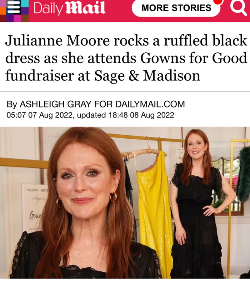 "Julianne Moore was all smiles as she sported a long black dress at the Gowns for Good fundraiser on Saturday. The 61-year-old actress looked elegant in the sheer and ruffled frock, pairing it with a black open-toe platform shoe. The event was held at and live-streamed from retail store Sage & Madison in Sag Harbor, New York."