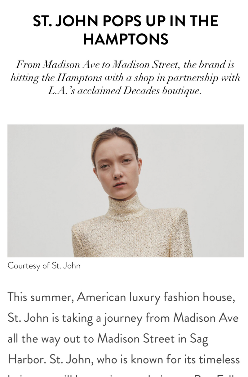 "This summer, American luxury fashion house, St. John is taking a journey from Madison Ave all the way out to Madison Street in Sag Harbor. St. John, who is known for its timeless knitwear, will be setting up their new Pre-Fall 2022 collection out East. St. John will open for a pop-up at Sage & Madison in Sag Harbor Village, and the assortment will be available from July 28 – August 1."