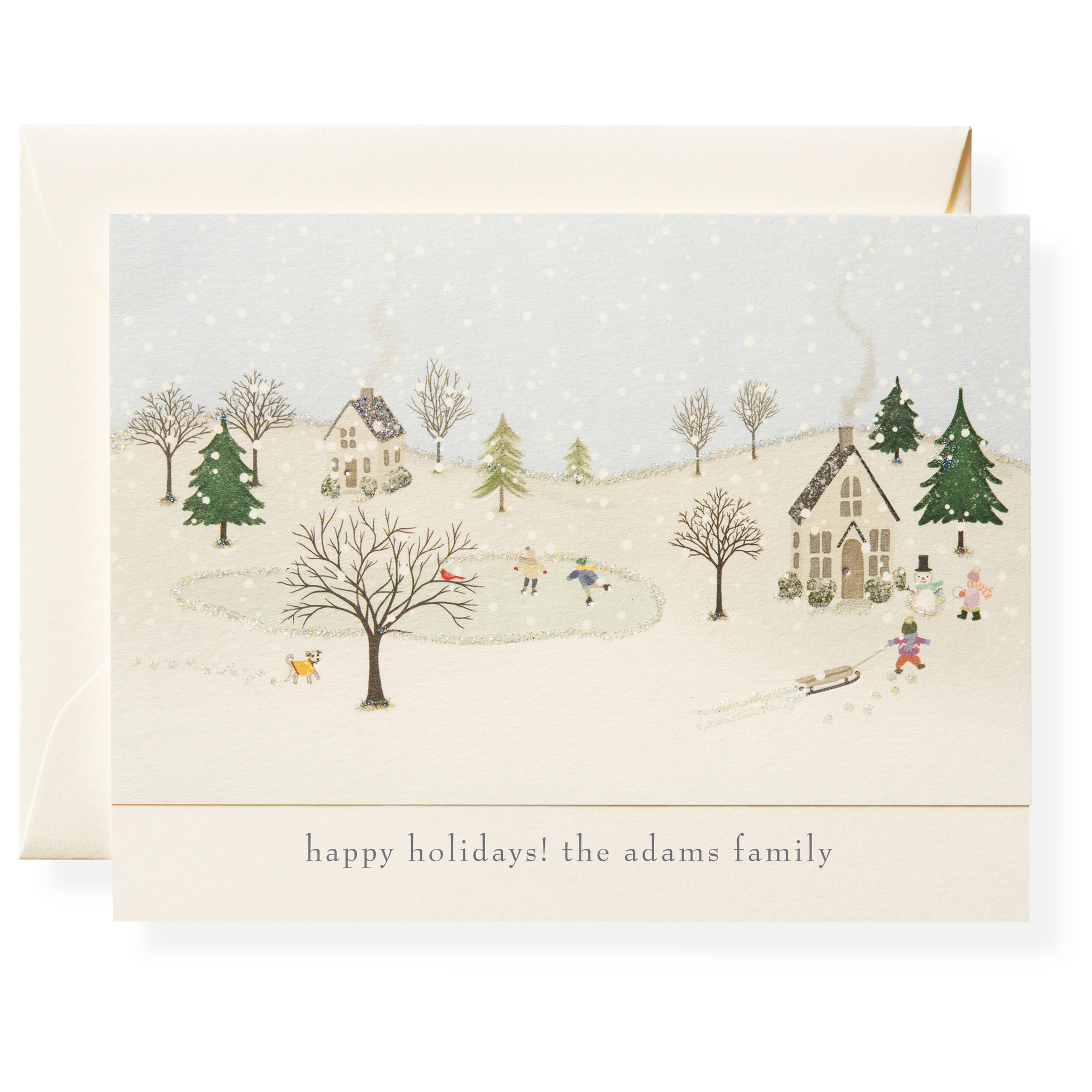 The December Note Card is printed, hand-glittered, and foiled in Memphis, TN. Hand crafted artwork, full color ink printed on natural white paper, hand-glittered, letterpress printed in silver foil, and paired with a natural white envelope. Top-folded card, blank on the inside. Paper color | natural white. Envelope color | natural white. Print process | full color + letterpress Embellishment | hand-glittered + silver foil Dimensions | 5.5 x 4.25 inches.