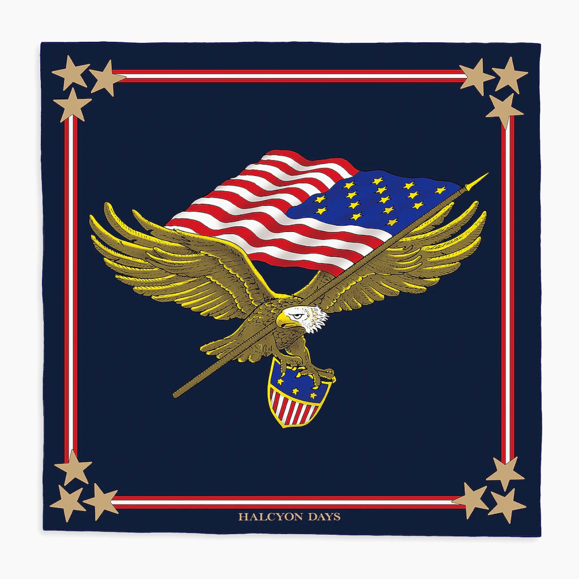 The Star-Spangled Banner silk scarf has been entirely made in England using a combination of traditional and contemporary techniques.The American Eagle adorns this Halcyon Days piece, set against a deep blue background.