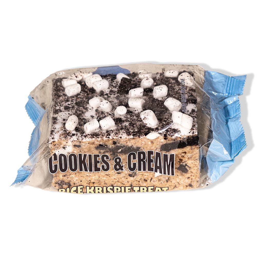 This Jumbo Rice Krispie Treat is loaded with crushed Oreo Cookies and natural cookies & cream flavor. The treat is topped with fresh vanilla marshmallow and more crushed Oreos.