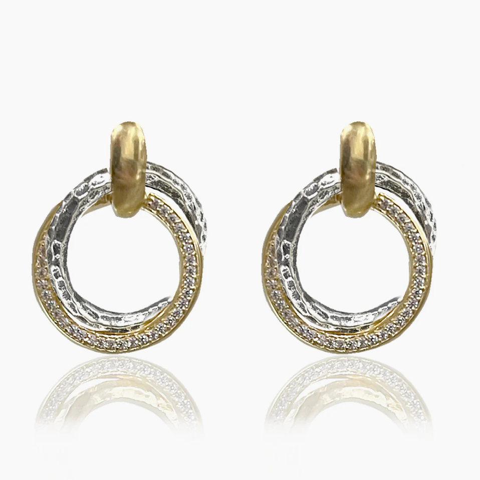 These eye-catching earrings feature a sophisticated blend of hammered and smooth14K gold and sterling silver plated circles, creating a layered, dimensional look. A round row of pavé cubic zirconia adds a touch of sparkle, while stainless steel posts with custom logo silicon center backs ensure a secure and comfortable fit. Thelightweight, teardrop design measures just over 1" in total length—perfect for day-to-night elegance.