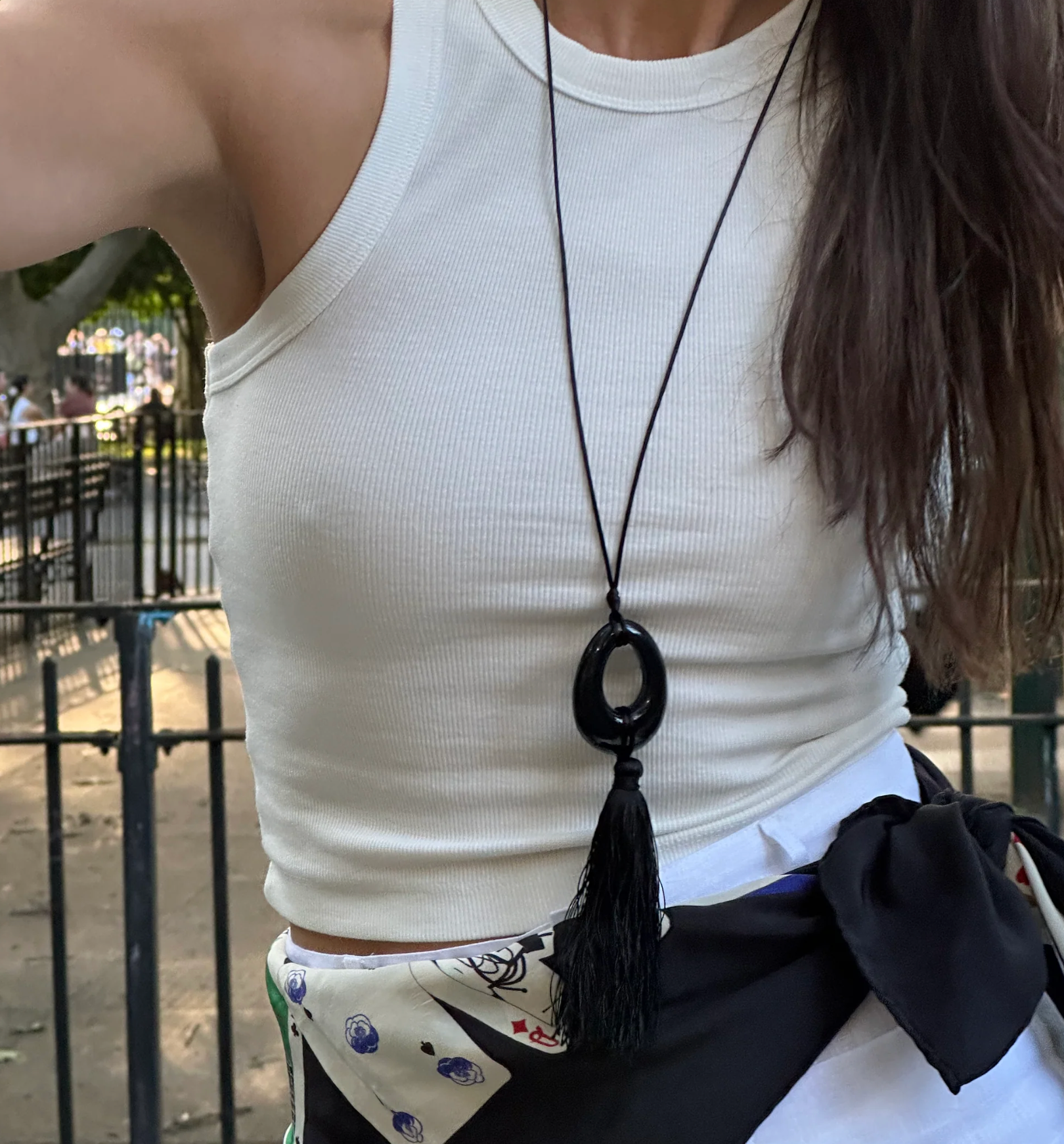 This black agate pendant hanging from a silk cord with a handmade tassel is exactly the necklace you want to be wearing now! This pendant goes with absolutely everything in your closet and will still look chic for many seasons to come. Black agate is known for symbolizing strength, courage and balance.