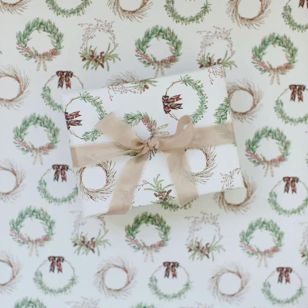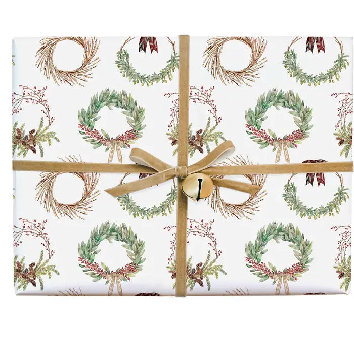 This whimsical wreath Christmas wrapping paper makes sure thoughtful gifts stand out! This Christmas gift wrap is thick but easily wrappable paper (no more tearing corners!) is recyclable. As always, this gift wrap is hand-painted, hand-packaged, and printed locally.